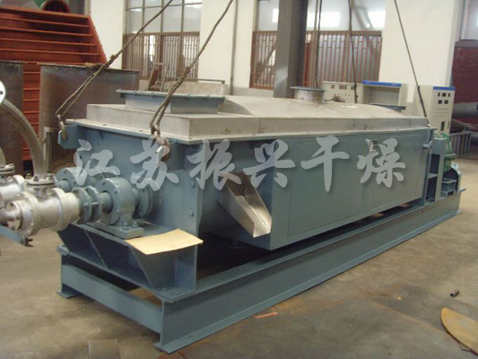 振興干燥研制的槳葉干燥機(jī),空心軸上密集排列 著楔型中空漿葉,熱介質(zhì)經(jīng)空心軸流經(jīng)漿葉。單位有效容積內(nèi)傳熱面積很 大,熱介質(zhì)溫度從-40℃到320℃,可以是水蒸汽,也可以是液體型:如熱 水、導(dǎo)熱油等。間接傳導(dǎo)加熱,沒有攜帶空氣帶走熱量,熱量均用來加熱 物料。熱量損失僅為通過器體保溫層向環(huán)境的散熱。楔型漿葉傳熱面具有 自清潔功能。物料顆粒與楔型面的相對(duì)運(yùn)動(dòng)產(chǎn)生洗刷作用,能夠洗刷掉楔 型面上附著物料,使運(yùn)轉(zhuǎn)中一直保持著清潔的傳熱面。漿葉干燥機(jī)的殼體 為Ω型,殼體內(nèi)一般安排二到四根空心攪拌軸。殼體有密封端蓋與上 蓋,防止物料粉塵外泄而充分發(fā)揮作用。